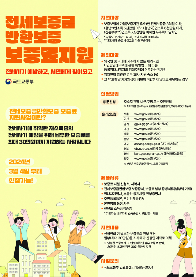 전세보증금 반환보증 보증료를 최대 30만원 지원하는 사업이 전 연령층으로 확대 시행되었습니다. 한정된 예산으로 선착순 지원하니 조건 맞는다면 위를 통해 바로 신청해보시길 바랍니다!!!